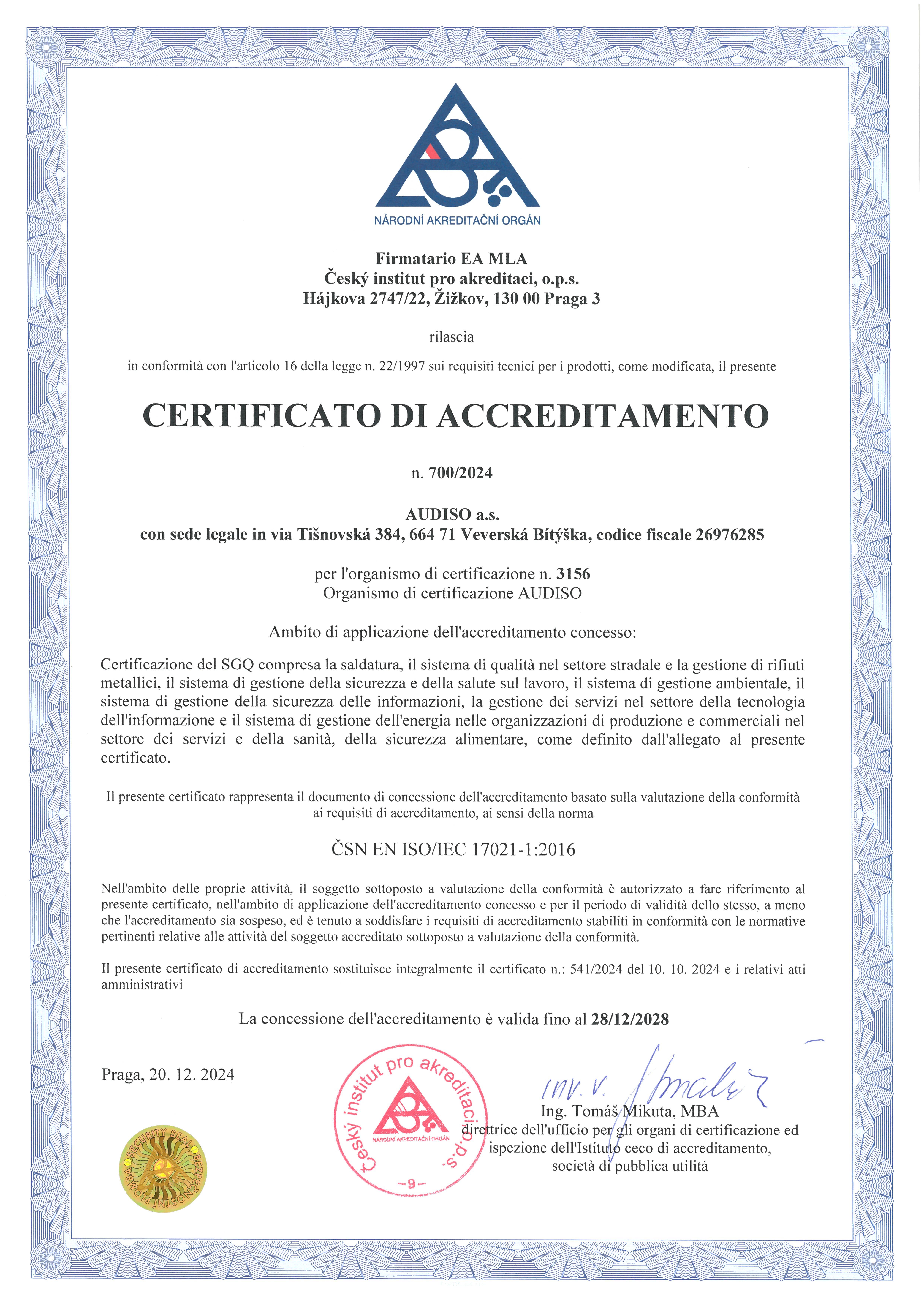 - Per garantire la coerenza di tutti i processi, rispettiamo il nostro sistema di gestione della qualità in conformità alle norme ČSN EN ISO/IEC 17029:2020, ČSN EN ISO 14065:2022 e alle norme e direttive correlate, che manteniamo e miglioriamo in linea con gli standard pertinenti e l’evoluzione delle condizioni di mercato.